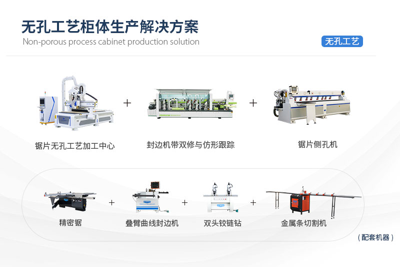 ?無孔工藝柜體生產(chǎn)解決方案無孔工藝柜體生產(chǎn)解決方案,主要由無孔工藝加工中心、鋸片側(cè)孔機(jī)、全自動封邊機(jī)三種設(shè)備組成,可用于加工生產(chǎn)板式家具、櫥柜、衣柜、兒童家具等柜體的生產(chǎn)加工,滿足家具生產(chǎn)廠家對無孔家具(使用隱形連接件連接)、板式家具(使用二合一、三合一連接件)及普通板式家具的加工需求。