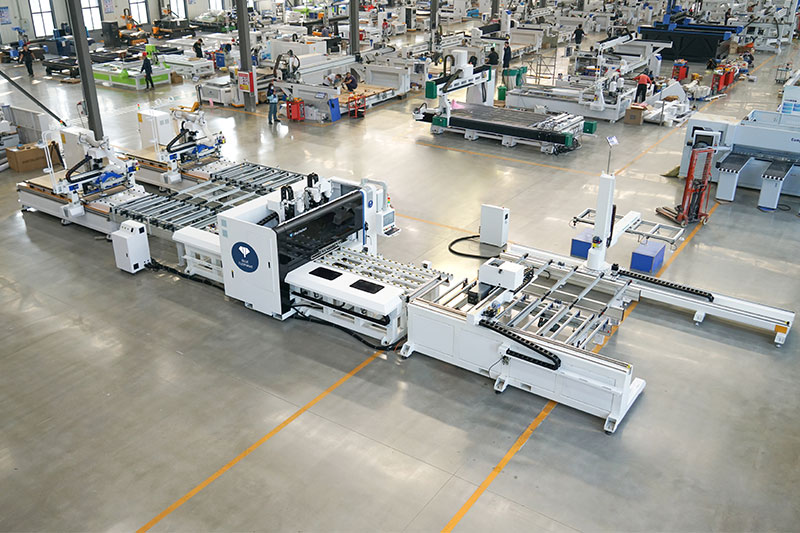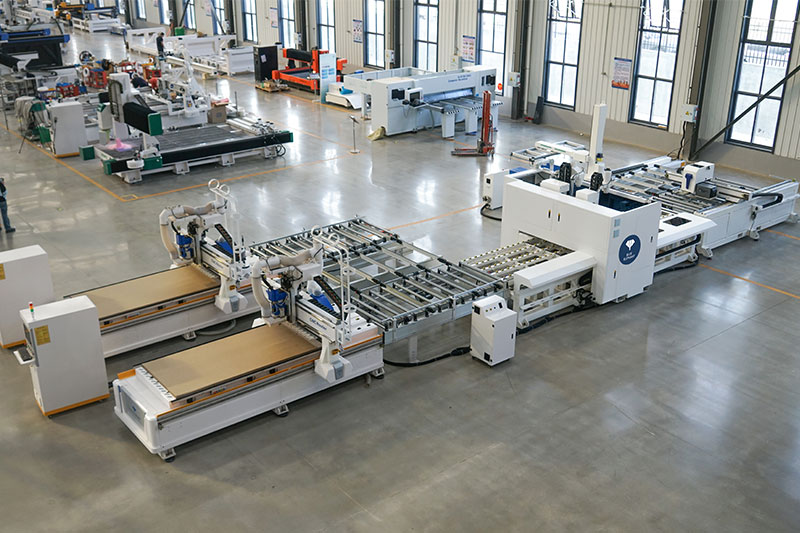 一拖二貼標(biāo)鉆切單元是一套自動(dòng)化程度比較高的數(shù)控開(kāi)料解決方案。由三工位龍門上料、自動(dòng)貼標(biāo)機(jī)、雙鉆包六面鉆、兩臺(tái)全自動(dòng)數(shù)控開(kāi)料機(jī)以及動(dòng)力滾筒線、中控系統(tǒng)組成??蓪?shí)現(xiàn)自動(dòng)上料、自動(dòng)貼標(biāo)、上下孔槽及切割加工。是一種自動(dòng)化程度高,效率高、性價(jià)比高的板式家具自動(dòng)化生產(chǎn)方案。