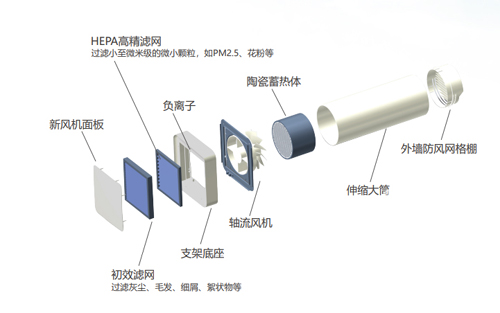 墻上打孔安裝,通過風機正壓送風,在引進室外新鮮空氣的同時,可對進風進行冷熱調節(jié),并有效去除空氣中的污染物。